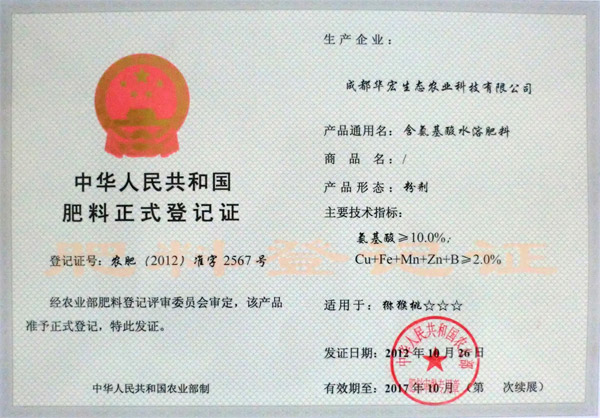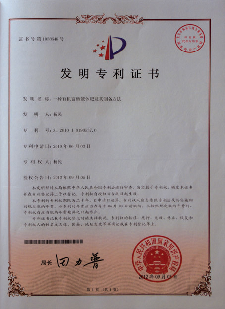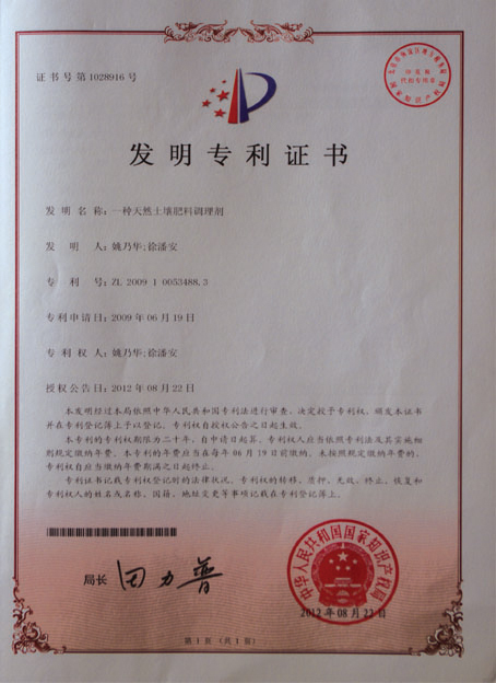 專利權(quán)屬 2013/5/22 華宏生物 土壤調(diào)理劑專利證書 天銅專利證書 太陽(yáng)風(fēng)專利證書 吉祥雨專利證書 富硒液態(tài)肥專利證書 多喜專利證書 艾思硼專利證書 氨基酸水溶肥料正式登記證
