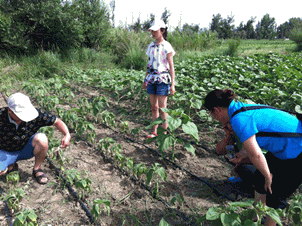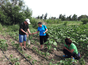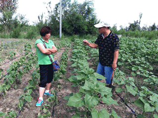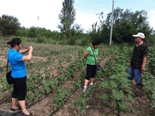 圖9:三位專家在地里察看 圖10:科技特派員認(rèn)真聽(tīng)取公司劉總講解列當(dāng)?shù)奈:头乐未胧?/span>