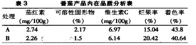 番茄品質(zhì)試驗(yàn)數(shù)據(jù)表明,茄紅素含量對(duì)照比處理要低0.48mg/l00g,可溶性固形物低0.67%,維生素C含量低0.83mg/100g,爛果率高5.38%。著色率低3.16%。