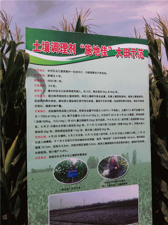 圖:“施地佳”土壤調(diào)理劑在甘肅張掖的大田示范牌