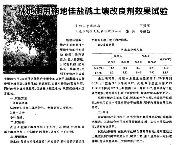 《農(nóng)村科技》2010年第1期 林地施用“施地佳”鹽堿土壤改良劑效果試驗(yàn)