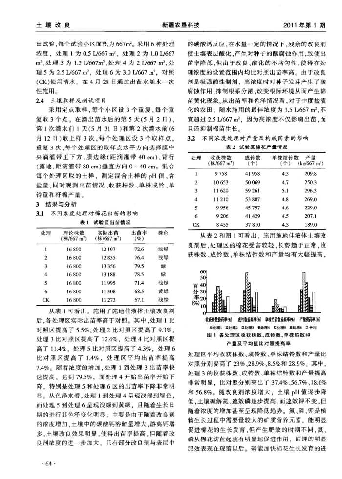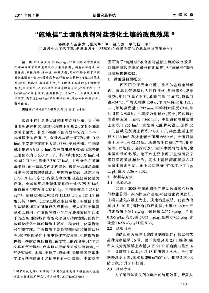 《新疆農(nóng)墾科技》2011年第1期 “施地佳”土壤調(diào)理劑對鹽漬化土壤的改良效果