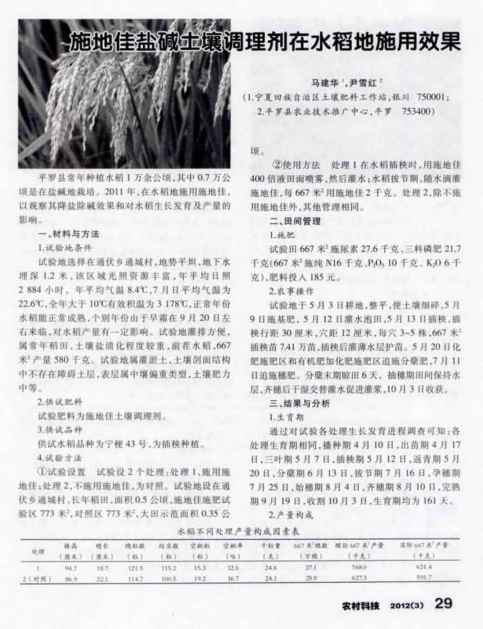 《農(nóng)村科技》2012年第3期 “施地佳”鹽堿土壤調(diào)理劑在水稻地施用效果