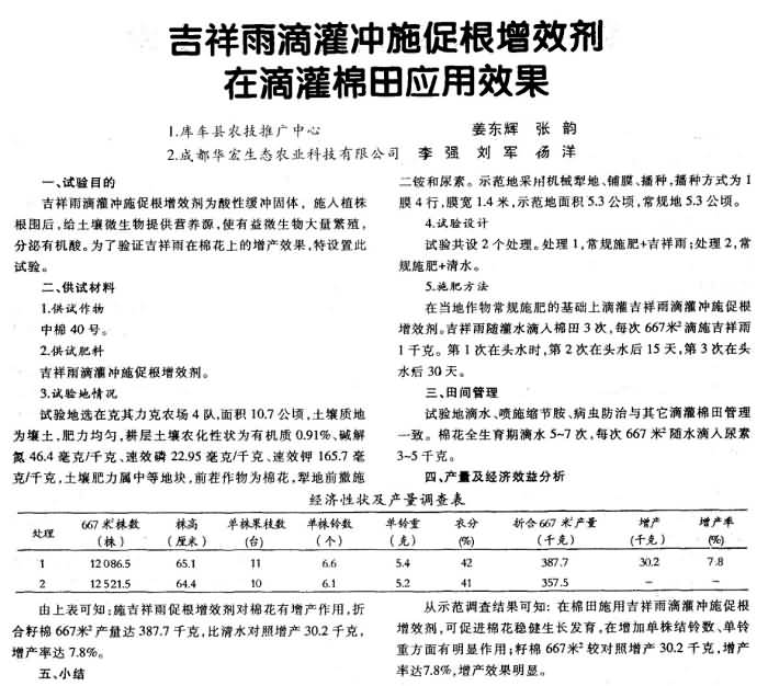 《農(nóng)村科技》2010年第9期 “吉祥雨”滴灌沖施促根增效劑在滴灌棉田應(yīng)用效果
