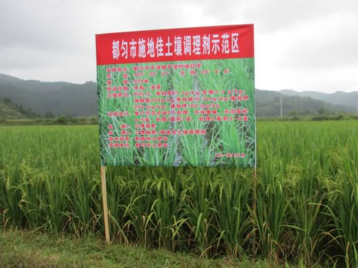 2014年農(nóng)業(yè)部全國農(nóng)技推廣服務(wù)中心安排在貴州省都勻市土肥站進行酸化土壤調(diào)理的試驗,試驗結(jié)果顯示“施地佳”酸化土壤調(diào)理劑第一年在當(dāng)?shù)刂饕Z食作物水稻上的試驗成功,實驗結(jié)果土壤酸度降低,土壤容重降低,稻谷增產(chǎn)幅度達到6%以上,我們的試驗計劃是三年定點示范,為我們的土壤改良總結(jié)一套成功的可行的實施方案。