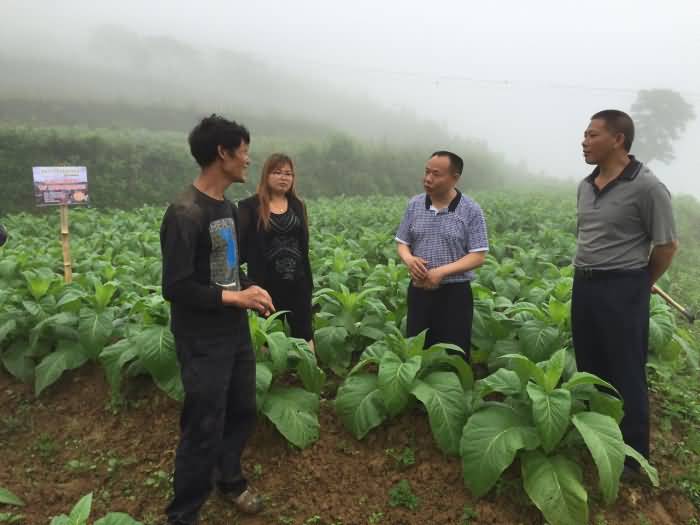 圖4:道真縣河口鄉(xiāng)煙葉管理站韓站長(zhǎng)陪同李總到施地佳示范大戶(hù)考察使用情況,煙農(nóng)高興地講今年他的煙葉長(zhǎng)勢(shì)是周邊最好的,高興之情溢于言表