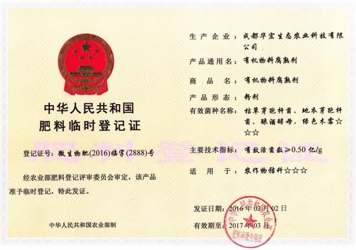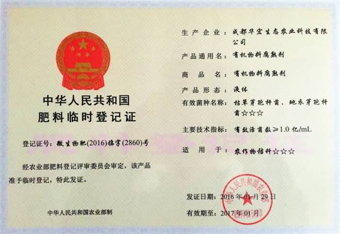 成都華宏生物喜獲國家液體、粉劑秸稈腐熟劑登記證