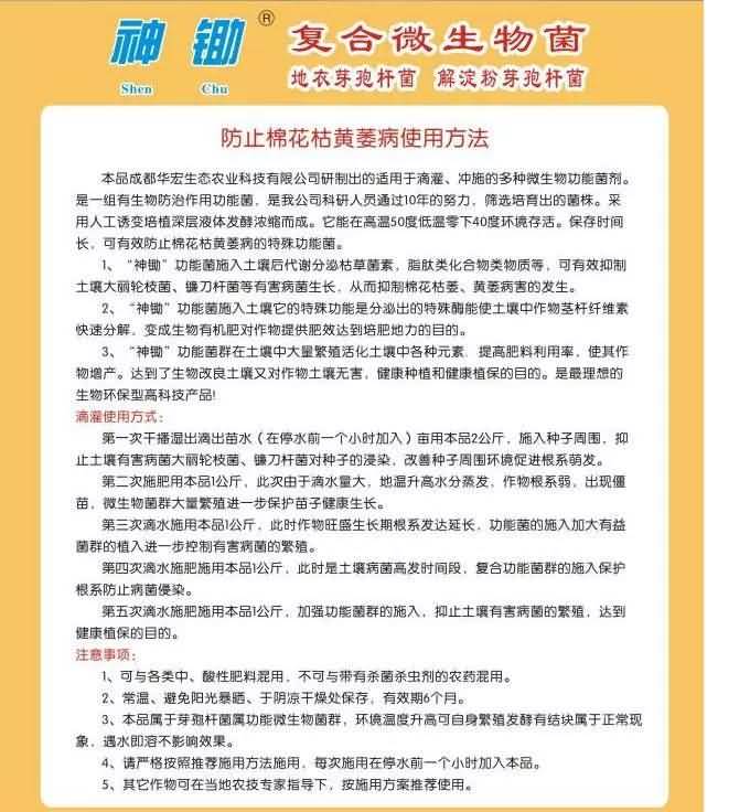 最近,棉花枯黃萎病縈繞在棉農(nóng)的心間,看看地里的棉花一天天的變樣,內(nèi)心充滿了焦慮!福音來(lái)了,新疆海文農(nóng)科代理的成都華宏微生物菌肥——神鋤,枯黃萎病的克星。
