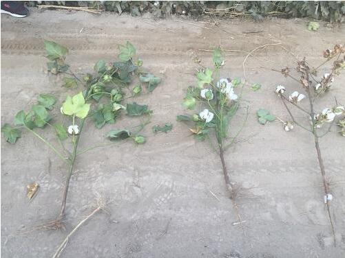 為了驗證其在棉花上的抗病效果,華宏技術(shù)團(tuán)隊于2016年首次在該棉田進(jìn)行試驗,試驗全部采用棉花膜下滴灌栽培技術(shù),從4月下旬播種期開始到9月取樣測產(chǎn),分別在試驗區(qū)和對照區(qū)各選三個調(diào)查點進(jìn)行定點調(diào)查棉花長勢。試驗發(fā)現(xiàn),施用“神鋤”的棉花在蕾期、花鈴期、鈴期、枯黃萎病病株均明顯低于未施“神鋤”的種植地,未施“神鋤”的對照區(qū)棉花在三個生育期發(fā)病率分別較施用“神鋤”的棉花增加89.4%、88.0%、84.9%,而且出現(xiàn)黃枯萎病的棉花以及整株干枯死亡的現(xiàn)象。