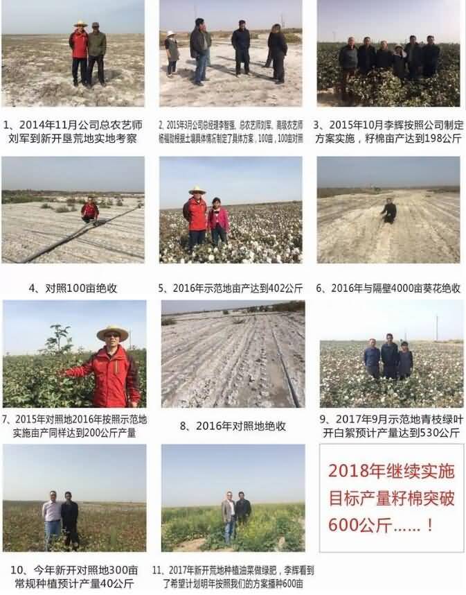 新疆石河子市農(nóng)八師142團(tuán)種植大戶5年的合作經(jīng)歷謝光武(139 9933 6438)新開荒地面積1000畝,1000畝幾十年棄耕地,通過(guò)4年的改良,目前2000畝變成高產(chǎn)田。棉花單產(chǎn)達(dá)到460公斤每畝。