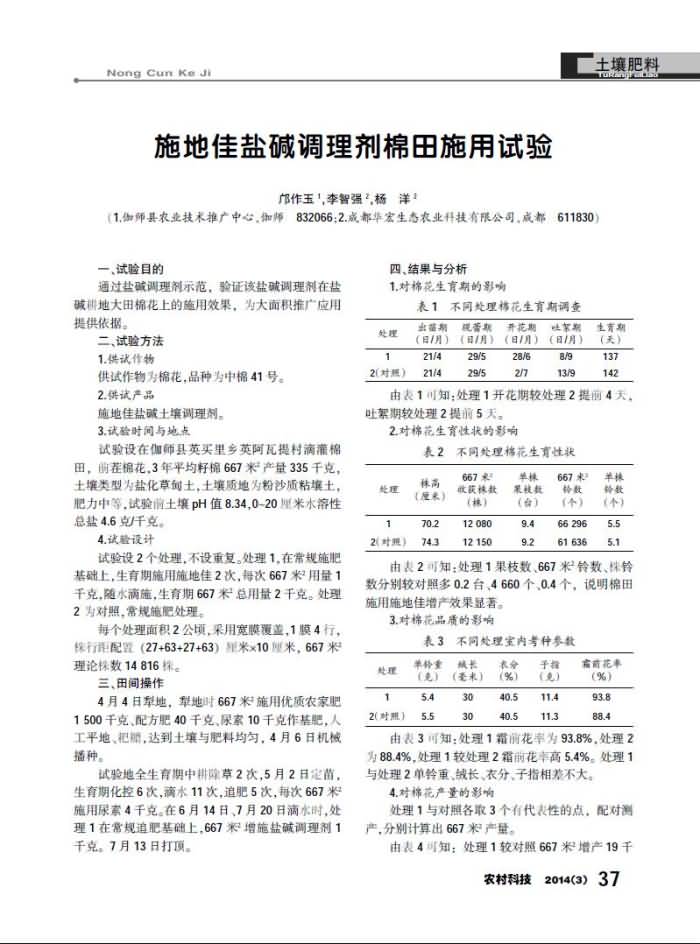 施地佳鹽堿調(diào)理劑棉田施用試驗(yàn)