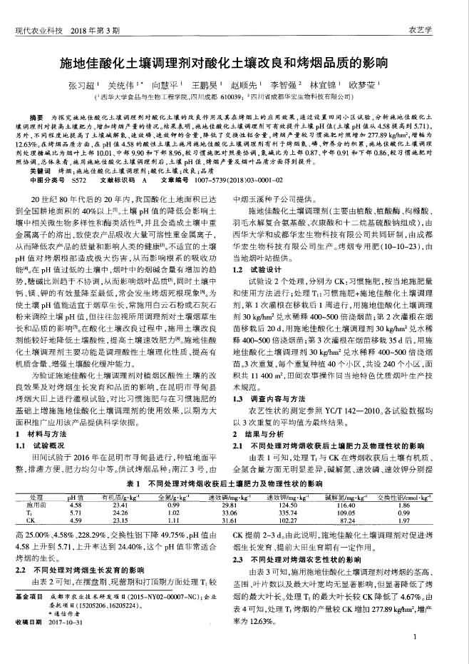 施地佳酸化土壤調(diào)理劑對酸化土壤改良和烤煙品質(zhì)的影響