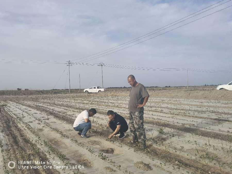 2022年5月12日播種的棉花,6月1日總農(nóng)藝師劉軍、本團(tuán)隊(duì)負(fù)責(zé)人小王、小楊在地里觀察棉花長(zhǎng)勢(shì)
