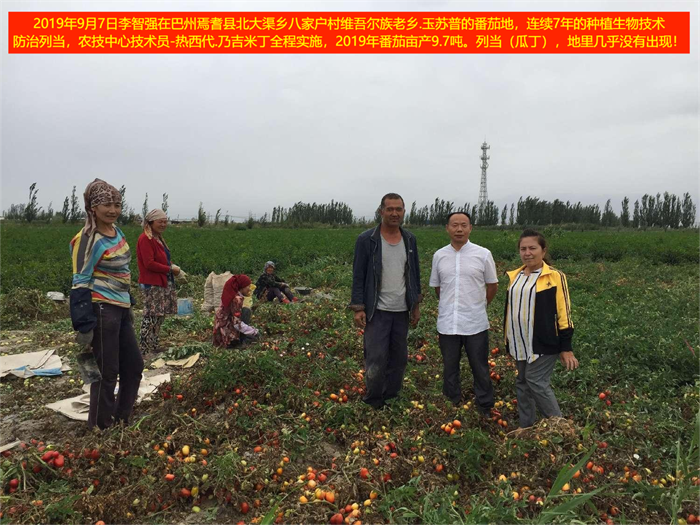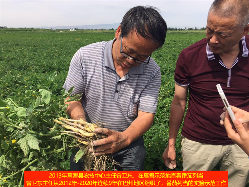 新疆巴州焉耆縣農(nóng)技中心 主任曾衛(wèi)東在維吾爾族老鄉(xiāng)的番茄地連續(xù)7年連作種植番茄-防列當(dāng)示范 2013-2019