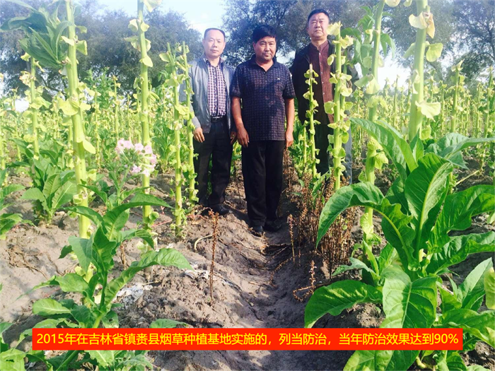 2015年遼寧省建平縣煙草列當(dāng)防治,當(dāng)年防治效果達(dá)到85%,連續(xù)同田進(jìn)行了2年,第二年達(dá)到90%