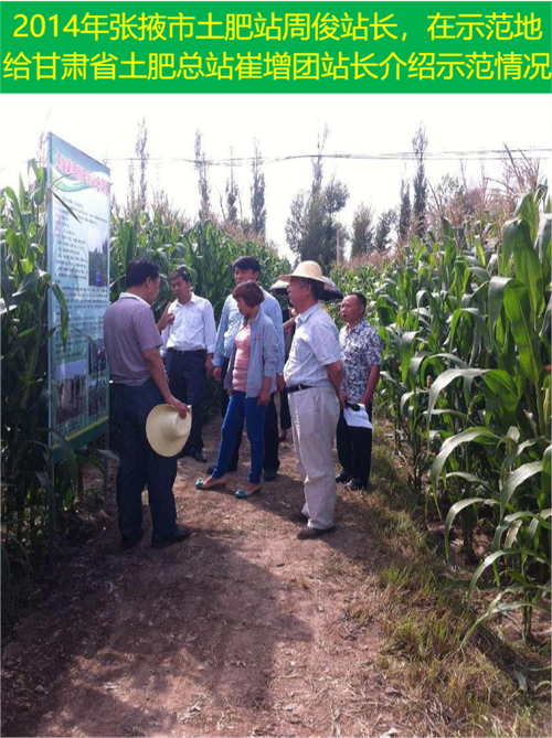 2014年農(nóng)業(yè)部全國(guó)農(nóng)技中心組織在張掖召開新型肥料,我們的土壤改良玉米示范地,楊帆處長(zhǎng)、董艷博士聽張掖市土肥站毛濤站長(zhǎng)匯報(bào)實(shí)驗(yàn)情況
